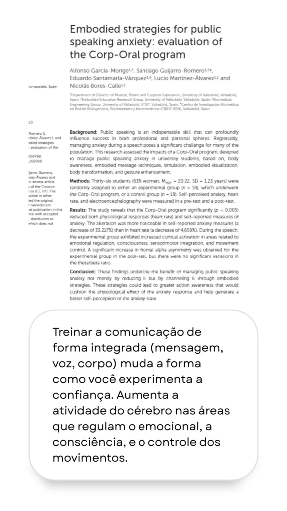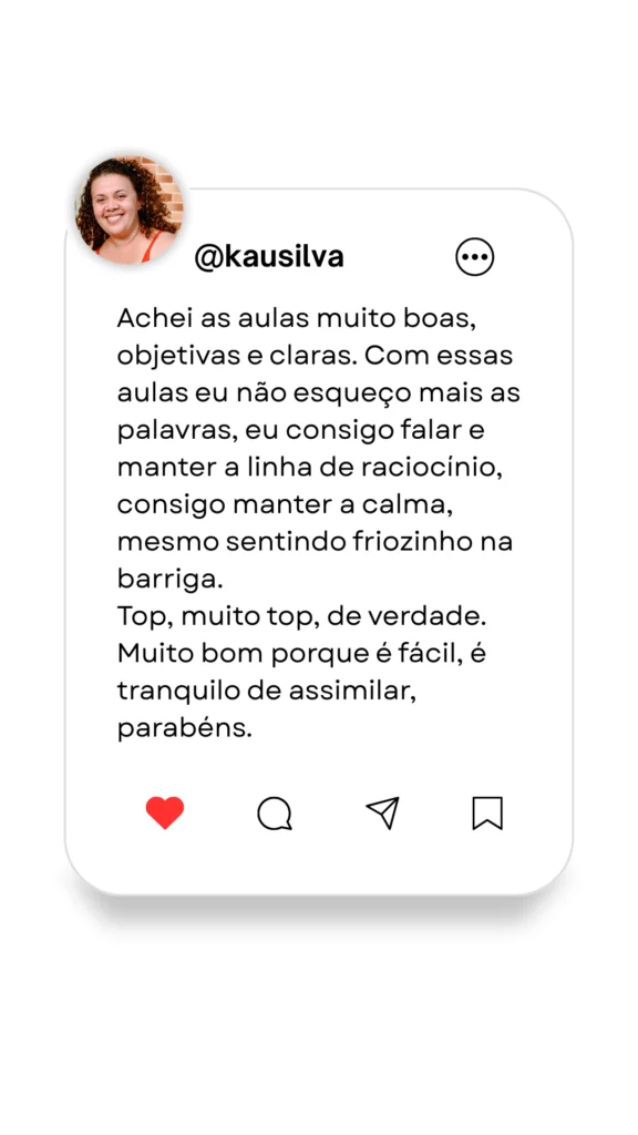 Vai aprender a organizar suas ideias com clareza, manter uma postura que transmite segurança (mesmo quando estiver nervoso) e usar a sua voz de forma mais firme, clara e compreensível.